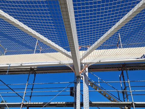 Arbeitsplattformnetze sind Auffangnetze, die dank rasterförmiger Vorspannung mit Spanngurten und geringer Maschenweite gut begehbar sind.